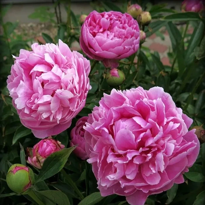 Цветы: махровые, насыщенно-розовые, диаметр — 18 см. В процессе цветения кончики лепестков светлеют и приобретают жемчужный оттенок.