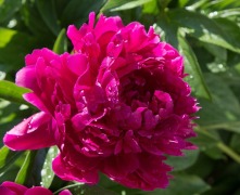Соцветия крупные (14–20 см в диаметре), пышные, махровые с многочисленными ярко-рубиновыми лепестками и фиолетовым отливом.