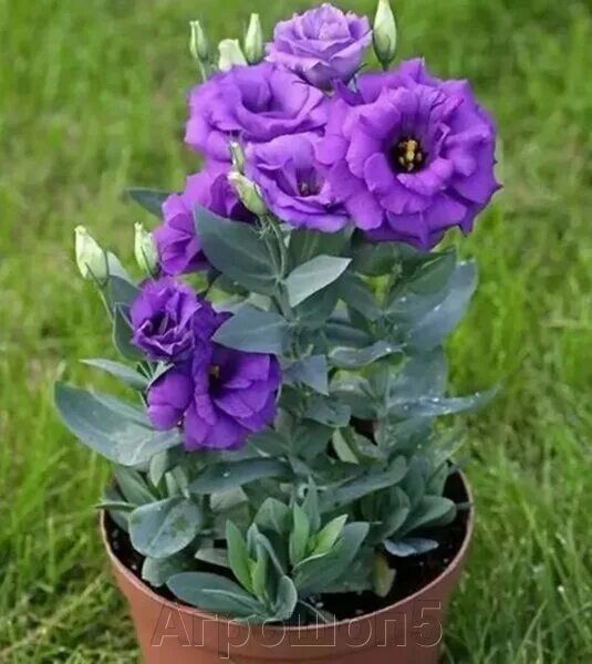 Очень привлекательное растение, высотой 25-30 см, с сизыми, словно покрытыми воском листьями. Крупные воронковидные махровые цветы синего цвета.