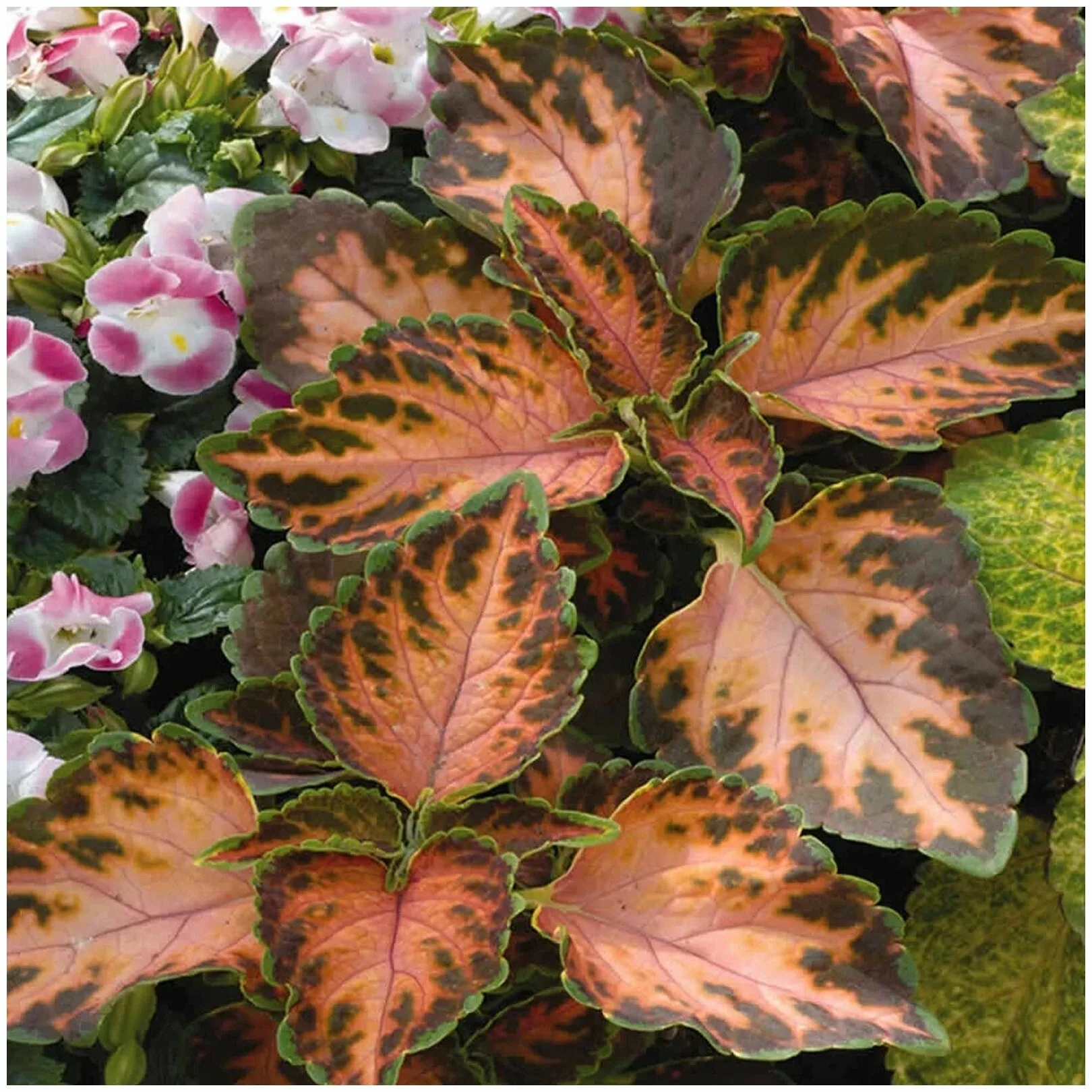 Окраска листа: кораллово-розовая с красно-коричневым окаймлением и тонкой зелёной каймой по краю.