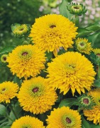Цветки золотисто-жёлтые с тёмно-коричневым центром, диаметром 10–12 см, полностью покрывают растение в период цветения.