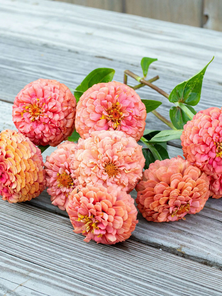 Окраска цветков — тёплый лососёвый оттенок. Цветки на длинных прочных стеблях напоминают небольшие махровые помпоны.
