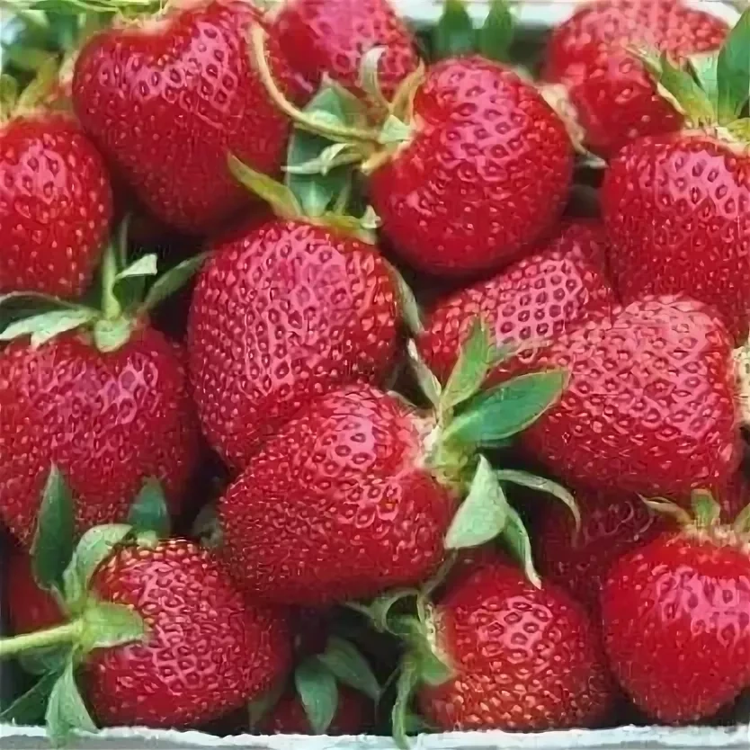 Ягоды: крупные, средней массой 30–35 г, правильной конусовидной формы, ярко-красного оттенка с глянцем. Мякоть сочная, сладкая, с приятным земляничным ароматом.