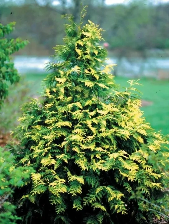 Хвоя: чешуйчатая, ярко-зелёная с поперечными золотистыми полосами, сохраняет окраску круглый год.